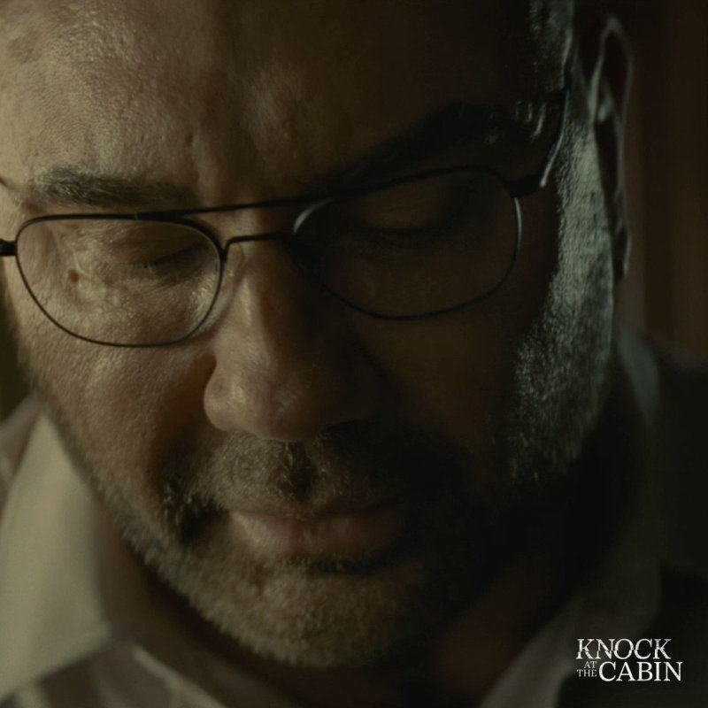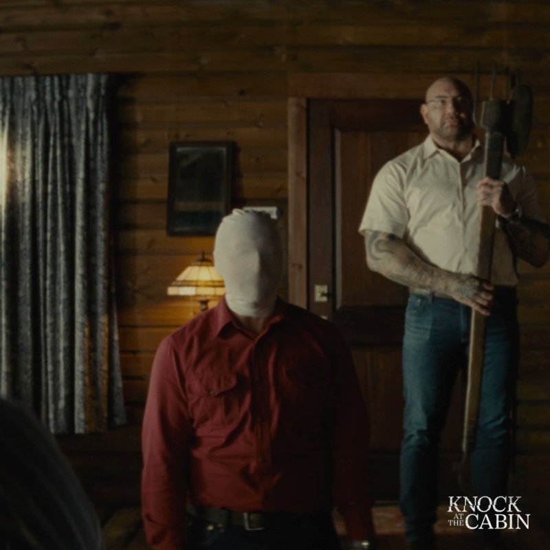 I’m happy to say any reservations I may have had were unwarranted. KNOCK AT THE CABIN is a fantastic addition to Shyamalan’s film library. It’s tense, gets right into the action without fucking around one bit. The acting is Oscar worthy, especially Dave Bautista’s Leonard. He’s not a wrestler in this. He’s a school teacher. And you believe it. You don’t see Drax on the screen, you see a caretaker who fears for the kids he coaches on a losing team. There’s all this, with each of the home invaders representing the Four Horsemen of the Apocalypse. But the thing that makes this move work is its attention to the source material. You see, KNOCK AT THE CABIN is about as faithful as you can be to a novel… with changing the ending.
