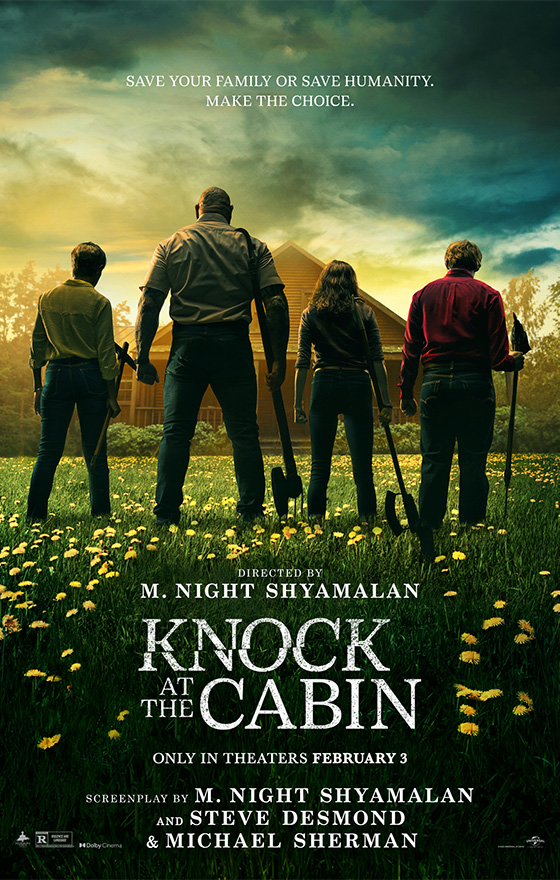 Shyamalan’s proving that when he adapts another author’s work, he can kick it up a notch and bring it to a new level. He did it with OLD, and he’s done it here again, with KNOCK AT THE CABIN. The adaptation of Paul Tremblay’s novel is a worthy addition to Shyamalan’s filmography. I highly recommend seeing this on the big screen, there is much to absorb on screen, and many visual clues and cues will be enhanced by the theatrical experience.