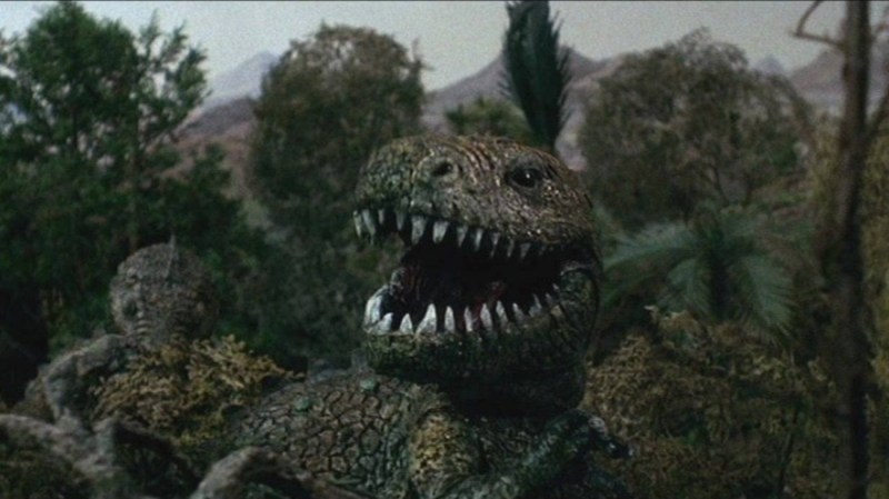 Yes, the quicksand, right down to the only manner you can save a person from quicksand with… a saproling! Quicksand is like the Ancient Indian Burial Ground. It’s not real. It doesn’t exist in reality. Now mentioning this in a review of a movie where a spaceman fights dinosaurs 65 million years ago might seem kind of silly, and if I was looking at this from a negative spectrum it would be. But I’m not. You see, the quicksand is just as much of an homage to classic dinosaur action films like VALLEY OF GWANGI. There was a time when tropes like quicksand were overused in nearly every film and many hours of television programming, not unlike curtain jerking wrestlers getting booked into a battle royal at Wrestlemania.